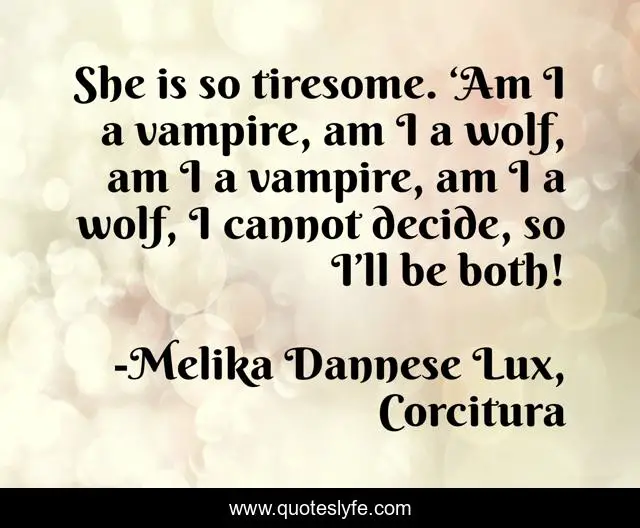 This page presents the quote "She is so tiresome. ‘Am I a vampire, am I a wolf, am I a vampire, am I a wolf, I cannot decide, so I’ll be both!". Author of this quote is Melika Dannese Lux, Corcitura. This quote is about werewolves, corcitura, vrykolakas, humor, vampires,.