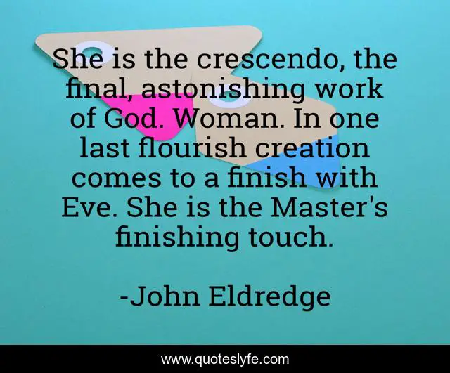 This page presents the quote "She is the crescendo, the final, astonishing work of God. Woman. In one last flourish creation comes to a finish with Eve. She is the Master's finishing touch.". Author of this quote is John Eldredge. This quote is about romance, love, marriage, affection, women,.