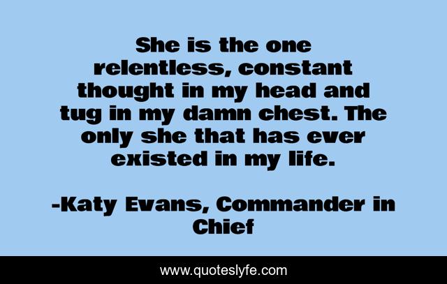 "Katy Evans, Commander in Chief Quotes." Quoteslyfe.com, 2025. Fri. 05 Dec. 2025. <https://www.quoteslyfe.com/quote/She-is-the-one-relentless-constant-thought-57307>.
