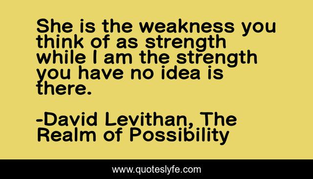 This page presents the quote "She is the weakness you think of as strength while I am the strength you have no idea is there.". Author of this quote is David Levithan, The Realm of Possibility. .