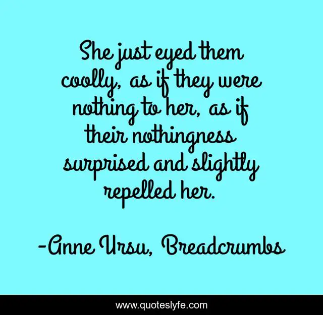 This page presents the quote "She just eyed them coolly, as if they were nothing to her, as if their nothingness surprised and slightly repelled her.". Author of this quote is Anne Ursu, Breadcrumbs. .