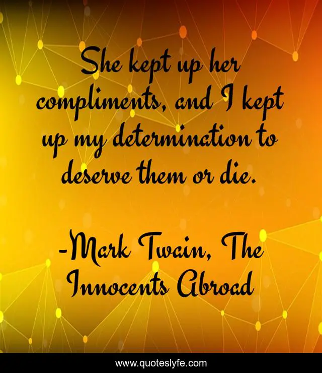 This page presents the quote "She kept up her compliments, and I kept up my determination to deserve them or die.". Author of this quote is Mark Twain, The Innocents Abroad. This quote is about positive-motivation, manipulation,.