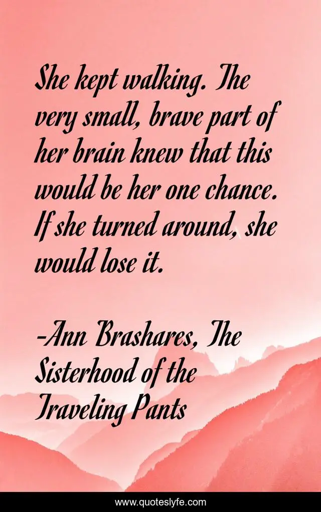 This page presents the quote "She kept walking. The very small, brave part of her brain knew that this would be her one chance. If she turned around, she would lose it.". Author of this quote is Ann Brashares, The Sisterhood of the Traveling Pants. This quote is about chance, courage, bravery,.