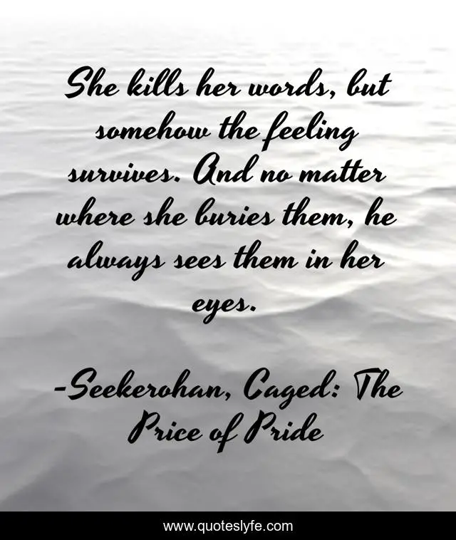 This page presents the quote "She kills her words, but somehow the feeling survives. And no matter where she buries them, he always sees them in her eyes.". Author of this quote is Seekerohan, Caged: The Price of Pride. This quote is about hide, forever-love, caged, soulmates, feelings, love, affection,.