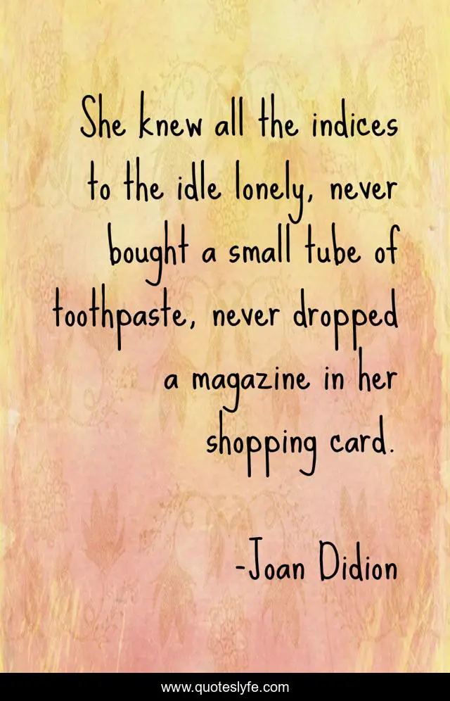 This page presents the quote "She knew all the indices to the idle lonely, never bought a small tube of toothpaste, never dropped a magazine in her shopping card.". Author of this quote is Joan Didion. .