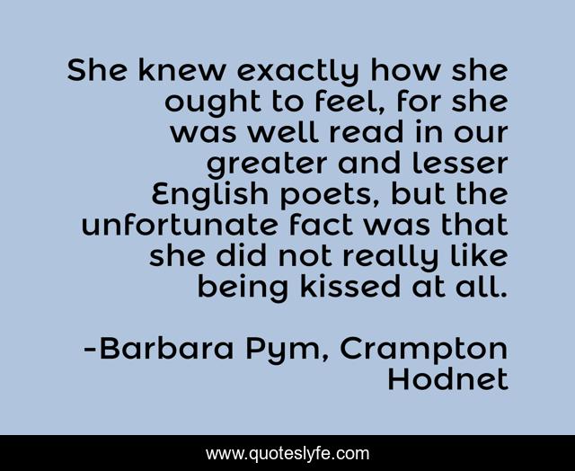 This page presents the quote "She knew exactly how she ought to feel, for she was well read in our greater and lesser English poets, but the unfortunate fact was that she did not really like being kissed at all.". Author of this quote is Barbara Pym, Crampton Hodnet. This quote is about romance, kissing, poets, literature, humor,.