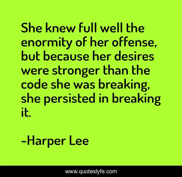 This page presents the quote "She knew full well the enormity of her offense, but because her desires were stronger than the code she was breaking, she persisted in breaking it.". Author of this quote is Harper Lee. This quote is about enthusiasm, spiritual, inspirational,.