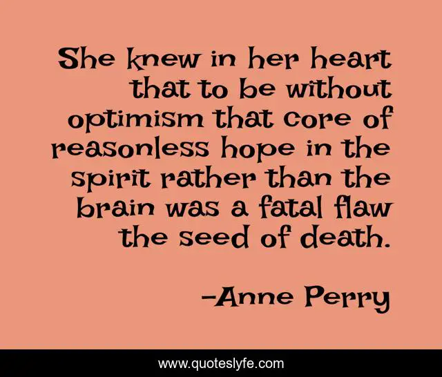 This page presents the quote "She knew in her heart that to be without optimism that core of reasonless hope in the spirit rather than the brain was a fatal flaw the seed of death.". Author of this quote is Anne Perry. .