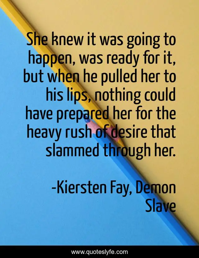 This page presents the quote "She knew it was going to happen, was ready for it, but when he pulled her to his lips, nothing could have prepared her for the heavy rush of desire that slammed through her.". Author of this quote is Kiersten Fay, Demon Slave. This quote is about quotes-from-books, paranormal-romance, science-fiction-romance, shadow-quest,.