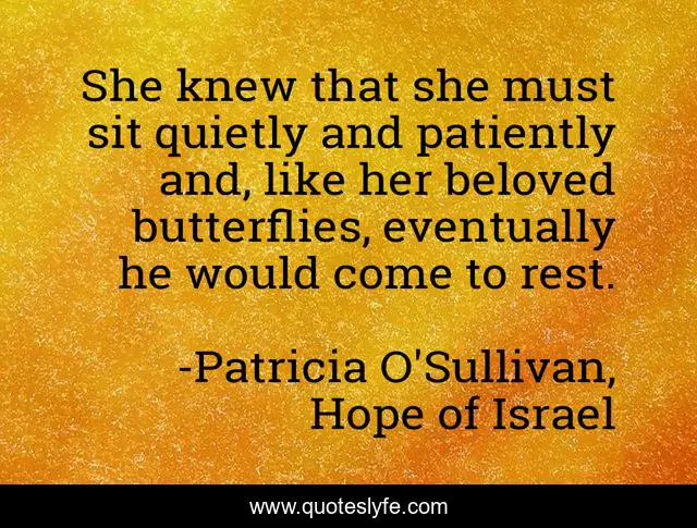 This page presents the quote "She knew that she must sit quietly and patiently and, like her beloved butterflies, eventually he would come to rest.". Author of this quote is Patricia O'Sullivan, Hope of Israel. .