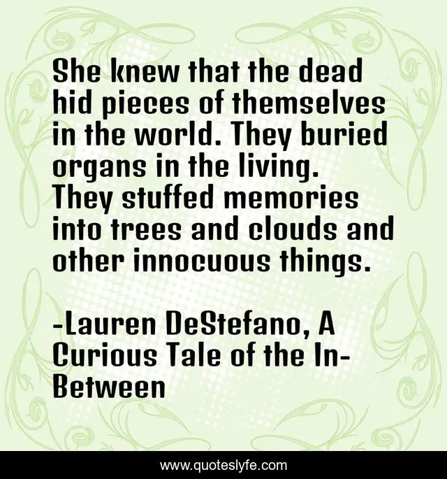 This page presents the quote "She knew that the dead hid pieces of themselves in the world. They buried organs in the living. They stuffed memories into trees and clouds and other innocuous things.". Author of this quote is Lauren DeStefano, A Curious Tale of the In-Between. This quote is about memories, poetic, death, poetic-prose,.
