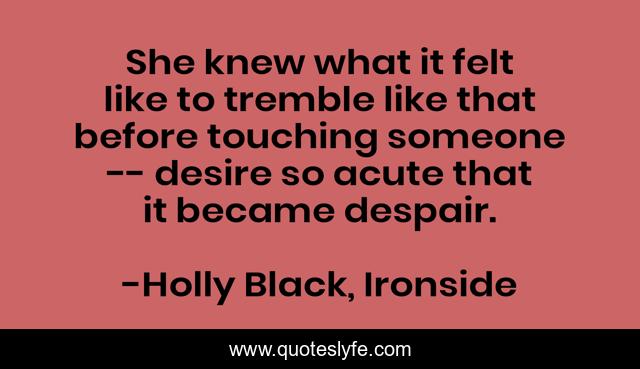 This page presents the quote "She knew what it felt like to tremble like that before touching someone -- desire so acute that it became despair.". Author of this quote is Holly Black, Ironside. This quote is about desire, kaye,.
