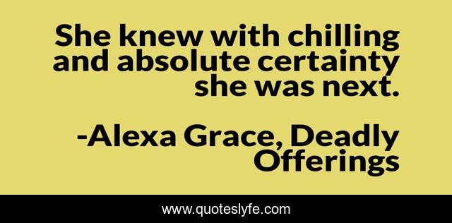 This page presents the quote "She knew with chilling and absolute certainty she was next.". Author of this quote is Alexa Grace, Deadly Offerings. This quote is about crime-fiction, crime-thriller, romantic-suspense, thriller, romance-novels,.