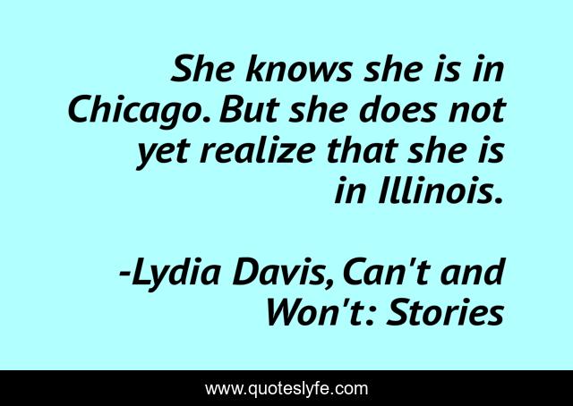 This page presents the quote "She knows she is in Chicago. But she does not yet realize that she is in Illinois.". Author of this quote is Lydia Davis, Can't and Won't: Stories. .