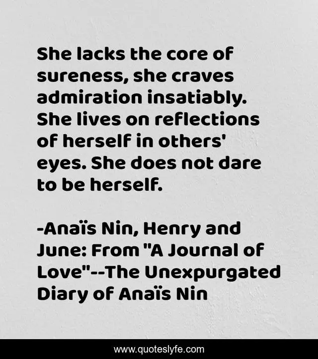 This page presents the quote "She lacks the core of sureness, she craves admiration insatiably. She lives on reflections of herself in others' eyes. She does not dare to be herself.". Author of this quote is Anaïs Nin, Henry and June: From "A Journal of Love"--The Unexpurgated Diary of Anaïs Nin. This quote is about admiration, beauty, personality,.