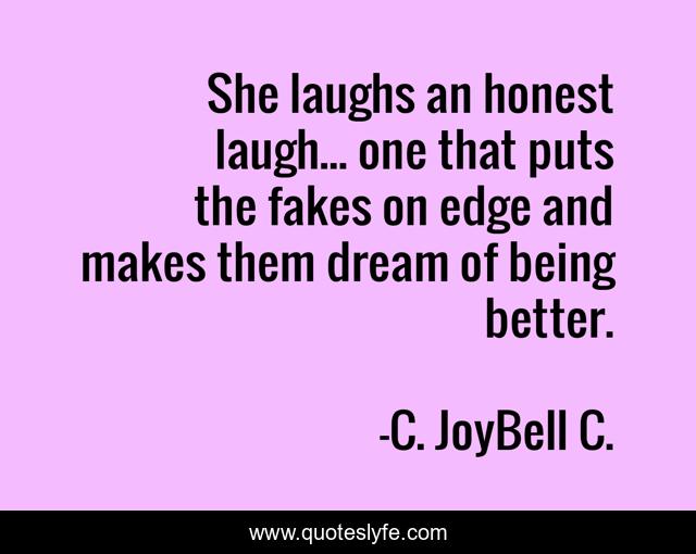 This page presents the quote "She laughs an honest laugh... one that puts the fakes on edge and makes them dream of being better.". Author of this quote is C. JoyBell C.. This quote is about inspirational-life, womens-inspirational, laughter, honesty, inspirational-moments,.