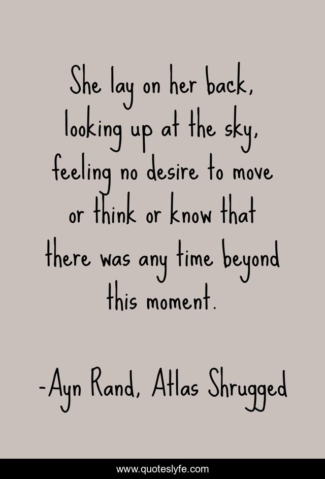 This page presents the quote "She lay on her back, looking up at the sky, feeling no desire to move or think or know that there was any time beyond this moment.". Author of this quote is Ayn Rand, Atlas Shrugged. This quote is about moment, atlas-shrugged, dagny-taggart,.
