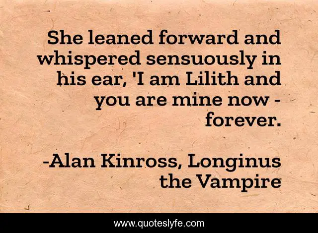 This page presents the quote "She leaned forward and whispered sensuously in his ear, 'I am Lilith and you are mine now - forever.". Author of this quote is Alan Kinross, Longinus the Vampire. This quote is about horror, seduction, lilith, demons, vampires,.