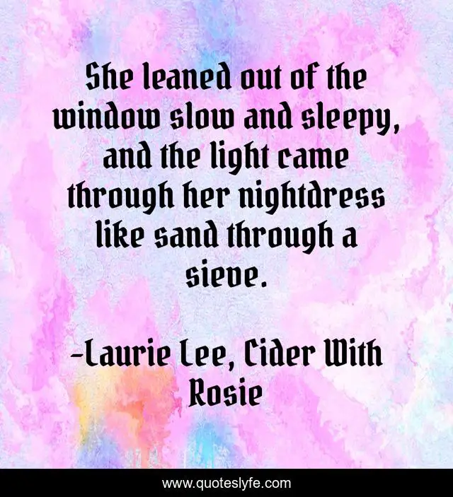 This page presents the quote "She leaned out of the window slow and sleepy, and the light came through her nightdress like sand through a sieve.". Author of this quote is Laurie Lee, Cider With Rosie. This quote is about memories, beautiful-description, colour, imagery, morning,.