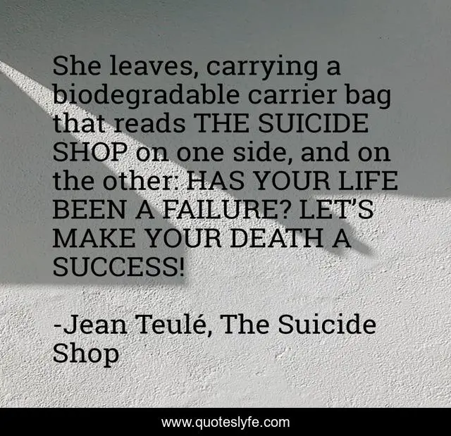 This page presents the quote "She leaves, carrying a biodegradable carrier bag that reads THE SUICIDE SHOP on one side, and on the other: HAS YOUR LIFE BEEN A FAILURE? LET’S MAKE YOUR DEATH A SUCCESS!". Author of this quote is Jean Teulé, The Suicide Shop. This quote is about failure, suicide, death,.