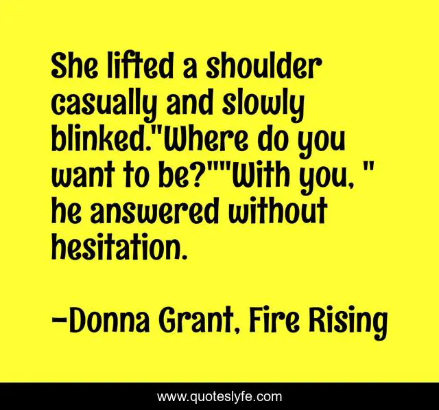 This page presents the quote "She lifted a shoulder casually and slowly blinked."Where do you want to be?""With you, " he answered without hesitation.". Author of this quote is Donna Grant, Fire Rising. This quote is about romance, highlanders, paranormal, dragons,.