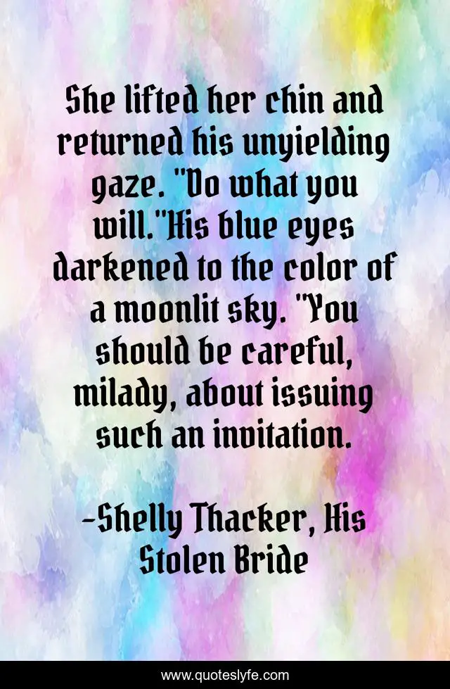 This page presents the quote "She lifted her chin and returned his unyielding gaze. "Do what you will."His blue eyes darkened to the color of a moonlit sky. "You should be careful, milady, about issuing such an invitation.". Author of this quote is Shelly Thacker, His Stolen Bride. This quote is about historical-romance, scottish-romance,.