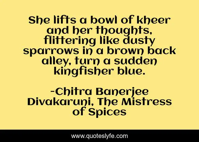"Chitra Banerjee Divakaruni, The Mistress of Spices Quotes." Quoteslyfe.com, 2025. Mon. 08 Dec. 2025. <https://www.quoteslyfe.com/quote/She-lifts-a-bowl-of-kheer-and-60855>.