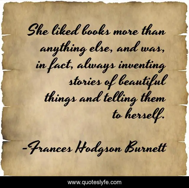 This page presents the quote "She liked books more than anything else, and was, in fact, always inventing stories of beautiful things and telling them to herself.". Author of this quote is Frances Hodgson Burnett. This quote is about beautiful, invention, books, stories, things,.