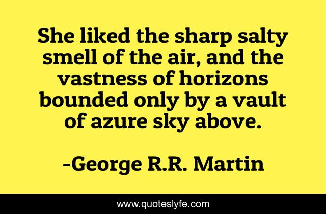 This page presents the quote "She liked the sharp salty smell of the air, and the vastness of horizons bounded only by a vault of azure sky above.". Author of this quote is George R.R. Martin. This quote is about salt, sky, sea, azure, vault, smell,.