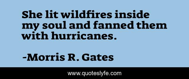 This page presents the quote "She lit wildfires inside my soul and fanned them with hurricanes.". Author of this quote is Morris R. Gates. This quote is about true-love, heart, lovers, love, soul-mates, poetry, quotes, home, affection,.