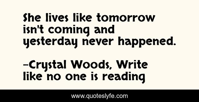 "Crystal Woods, Write like no one is reading Quotes." Quoteslyfe.com, 2025. Tue. 09 Dec. 2025. <https://www.quoteslyfe.com/quote/She-lives-like-tomorrow-isn-t-coming-87537>.