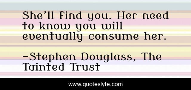 This page presents the quote "She’ll find you. Her need to know you will eventually consume her.". Author of this quote is Stephen Douglass, The Tainted Trust. This quote is about romance, trilogy, fathers-and-daughters, crime,.