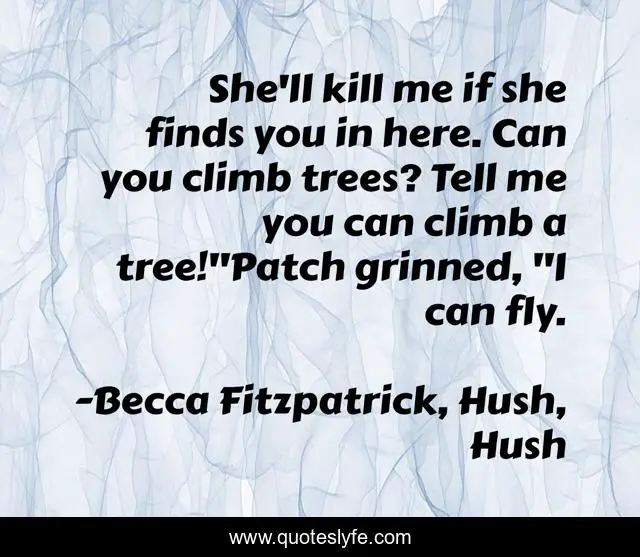 This page presents the quote "She'll kill me if she finds you in here. Can you climb trees? Tell me you can climb a tree!"Patch grinned, "I can fly.". Author of this quote is Becca Fitzpatrick, Hush, Hush. This quote is about fly, becca-fitzpatrick, angel, patch, hush, nora-grey,.