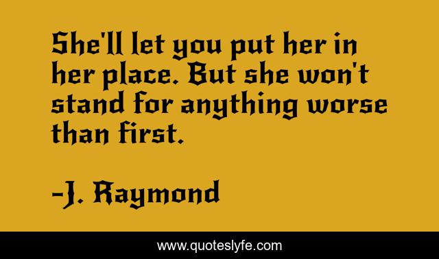 This page presents the quote "She'll let you put her in her place. But she won't stand for anything worse than first.". Author of this quote is J. Raymond. This quote is about woman, love, remembering-love, pondering, thought-provoking, passion, affection,.