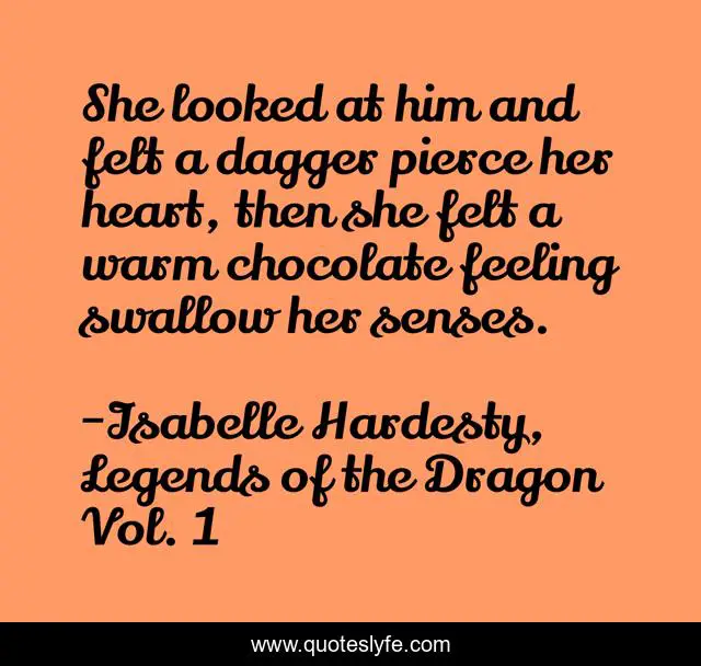 This page presents the quote "She looked at him and felt a dagger pierce her heart, then she felt a warm chocolate feeling swallow her senses.". Author of this quote is Isabelle Hardesty, Legends of the Dragon Vol. 1. This quote is about ya, urban-fantasy, fiction, fantasy, shapeshifters, young-adult,.
