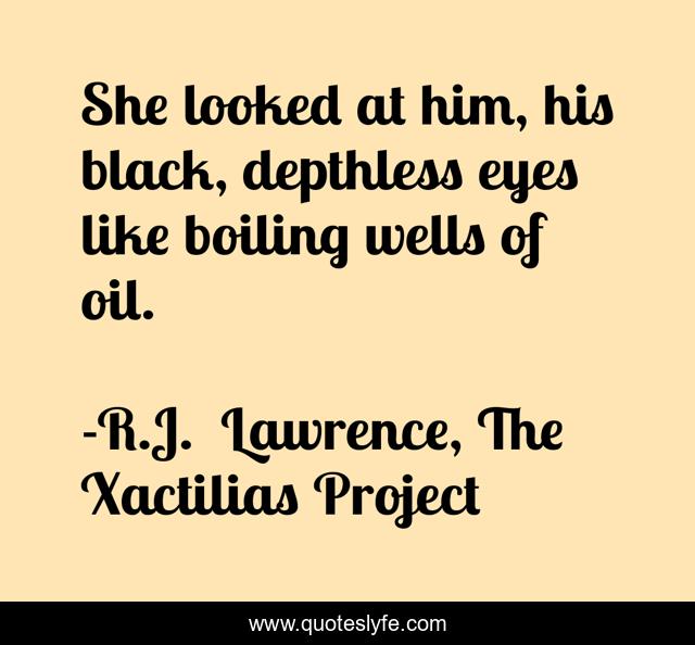 This page presents the quote "She looked at him, his black, depthless eyes like boiling wells of oil.". Author of this quote is R.J. Lawrence, The Xactilias Project. This quote is about scary, eyes, eye, intimidating, intimate, villain, eye-contact, villains,.