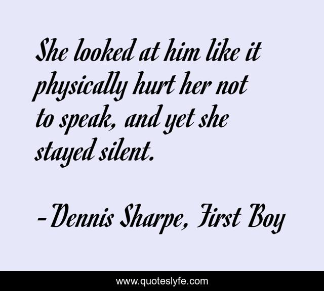 This page presents the quote "She looked at him like it physically hurt her not to speak, and yet she stayed silent.". Author of this quote is Dennis Sharpe, First Boy. This quote is about fear, emotional-abuse, silent-pain,.