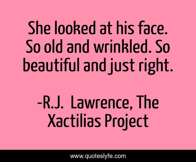 This page presents the quote "She looked at his face. So old and wrinkled. So beautiful and just right.". Author of this quote is R.J. Lawrence, The Xactilias Project. This quote is about aging, old-man, old-people, ageing, age, aging-well, old-age, aging-gracefully,.
