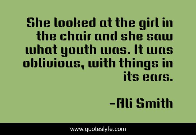 This page presents the quote "She looked at the girl in the chair and she saw what youth was. It was oblivious, with things in its ears.". Author of this quote is Ali Smith. This quote is about youth, oblivious, headphones, ears,.