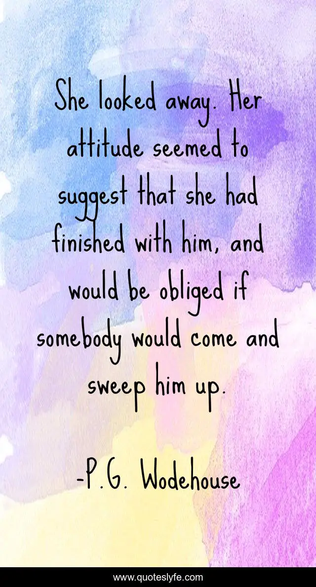 This page presents the quote "She looked away. Her attitude seemed to suggest that she had finished with him, and would be obliged if somebody would come and sweep him up.". Author of this quote is P.G. Wodehouse. This quote is about dismissal, life, writing,.