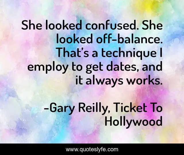 This page presents the quote "She looked confused. She looked off-balance. That’s a technique I employ to get dates, and it always works.". Author of this quote is Gary Reilly, Ticket To Hollywood. .