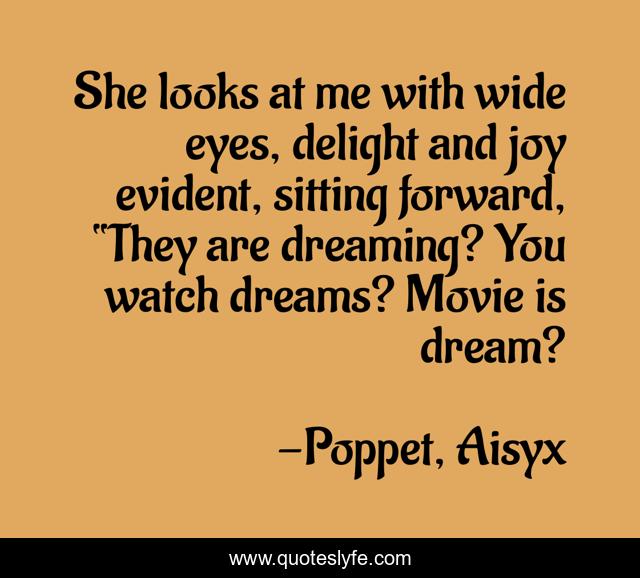 This page presents the quote "She looks at me with wide eyes, delight and joy evident, sitting forward, “They are dreaming? You watch dreams? Movie is dream?". Author of this quote is Poppet, Aisyx. This quote is about paranormal-romance, vampire-romance,.