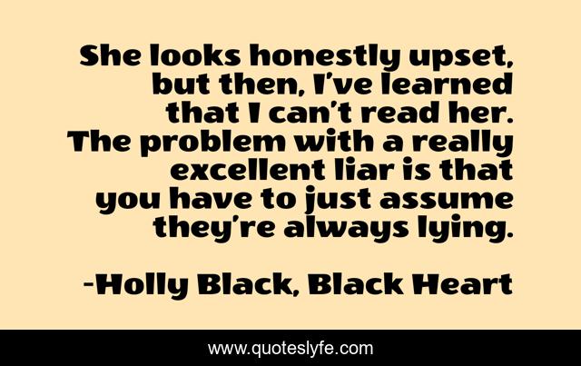 This page presents the quote "She looks honestly upset, but then, I’ve learned that I can’t read her. The problem with a really excellent liar is that you have to just assume they’re always lying.". Author of this quote is Holly Black, Black Heart. This quote is about liars, lying,.