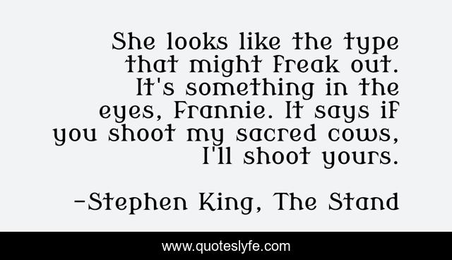 This page presents the quote "She looks like the type that might freak out. It's something in the eyes, Frannie. It says if you shoot my sacred cows, I'll shoot yours.". Author of this quote is Stephen King, The Stand. This quote is about madness, psychology,.
