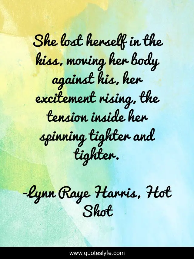 This page presents the quote "She lost herself in the kiss, moving her body against his, her excitement rising, the tension inside her spinning tighter and tighter.". Author of this quote is Lynn Raye Harris, Hot Shot. This quote is about military-romantic-suspense, hot-scene, steamy-romance, military-romance, alpha-males, romantic-suspense,.