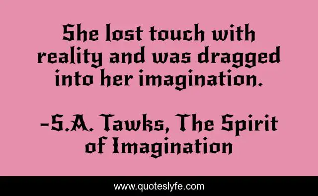 This page presents the quote "She lost touch with reality and was dragged into her imagination.". Author of this quote is S.A. Tawks, The Spirit of Imagination. This quote is about reading, spirituality, author, reality, imagination, reader, writing,.