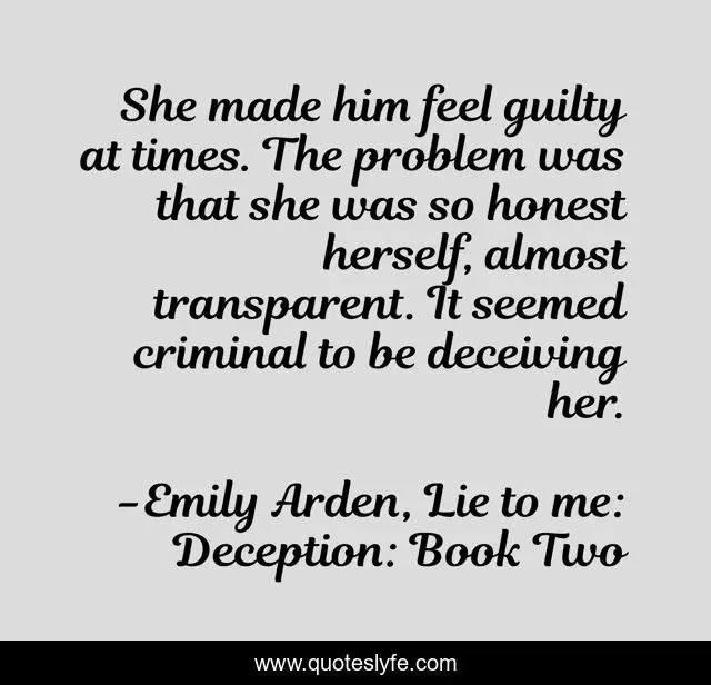 This page presents the quote "She made him feel guilty at times. The problem was that she was so honest herself, almost transparent. It seemed criminal to be deceiving her.". Author of this quote is Emily Arden, Lie to me: Deception: Book Two. This quote is about admiration, love, honesty, romance, guilt, affection,.