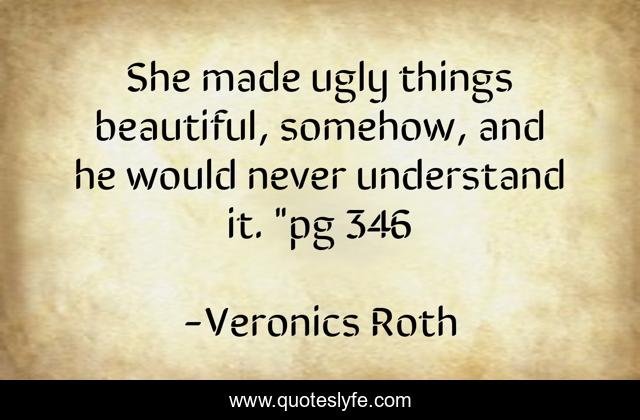 This page presents the quote "She made ugly things beautiful, somehow, and he would never understand it. "pg 346". Author of this quote is Veronics Roth. This quote is about beautiful-things, beautiful-people, ugly-things, understanding,.