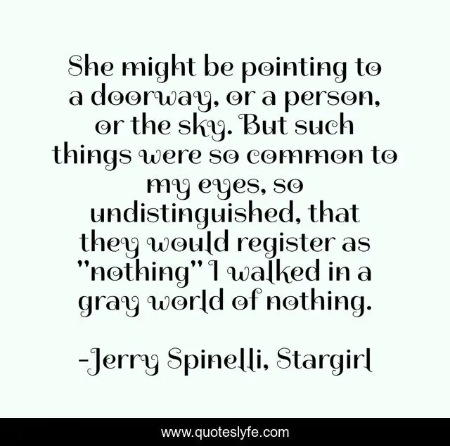 This page presents the quote "She might be pointing to a doorway, or a person, or the sky. But such things were so common to my eyes, so undistinguished, that they would register as "nothing" I walked in a gray world of nothing.". Author of this quote is Jerry Spinelli, Stargirl. This quote is about enthusiasm, inspirational,.