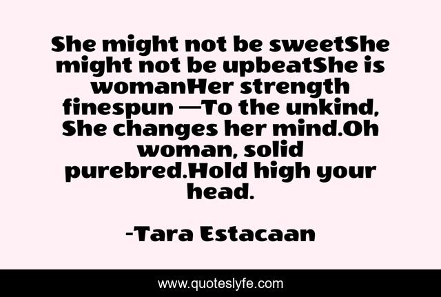 This page presents the quote "She might not be sweetShe might not be upbeatShe is womanHer strength finespun —To the unkind, She changes her mind.Oh woman, solid purebred.Hold high your head.". Author of this quote is Tara Estacaan. This quote is about feminine, woman, strength, woman-s-character,.